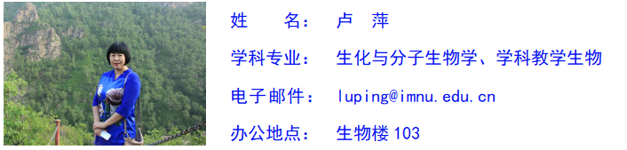 卢萍,女,蒙古族,中共党员,博士,必赢国际437官网教授,硕士生导师(生物化学与分子生物学、学科教学生物),蒙古国农业大学博士生导师,必赢国际437官网生物化学与分子生物学硕士学位点主任、教授委员会成员、中国遗传学会教育教学专业委员会委员、澳大利亚阿德莱德大学国家公派访问学者、内蒙古遗传学会副理事长、内蒙古生物化学与分子生物学会副理事长、内蒙古细胞生物学会常务理事、内蒙古医学会生物化学与分子生物学分会副主任委员、内蒙古草原学会理事、内蒙古自治区科普专家团成员,曾多年担任生物技术系主任、教工党支部书记、学院党总支委员。研究方向为遗传学、生物化学与分子生物学、分子生态学、植物种质资源学。主持国家自然科学基金项目3项、省部级科研项目4项、厅级项目1项,参加国家级和省部级科研项目10余项。发表SCI、CSCD及北大核心期刊论文80余篇,出版学术专著2部、国家级教材1部,获得必赢国际437官网科研成果奖和教学成果奖4项,被学校授予“优秀科研工作者”、“优秀研究生导师”、“爱岗敬业女职工”、“优秀班主任”、“优秀共产党员”、“优秀党务工作者”、“优秀党支部书记”、“就业工作优秀导师”、“五四青年团最佳支持者”等荣誉称号,主讲本科生“遗传学”(自治区精品课)、“基因工程”(校级精品课)、“分子生物学”、“生物学专业英语”、“专业实习”、“教学技能训练”,研究生“生物化学与分子生物学”、“基因工程学”、“生物学专业英语”、“现代生物技术”、“基因表达与调控”、“基因组学”等课程。
