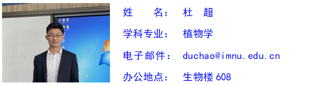 杜超,男,汉族,群众,博士,讲师,硕士研究生导师,生物技术系副主任,主要研究方向为植物逆境生理及分子生物学。主持内蒙古自然科学基金项目2项,内蒙古自治区直属高校基本科研业务费项目1项;参与国家自然科学基金项目3项,内蒙古自然科学基金项目2项。发表学术论文13篇、专利1项,获必赢国际437官网青年教师教学技能大赛一等奖、内蒙古自治区高等院校青年教师教学技能比赛一等奖。承担普通生物学、种子植物分类学、植物学实验、植物学实习、生物分类学实习、植物生物学、科学伦理、学术诚信和学术规范等本科生及研究生课程。