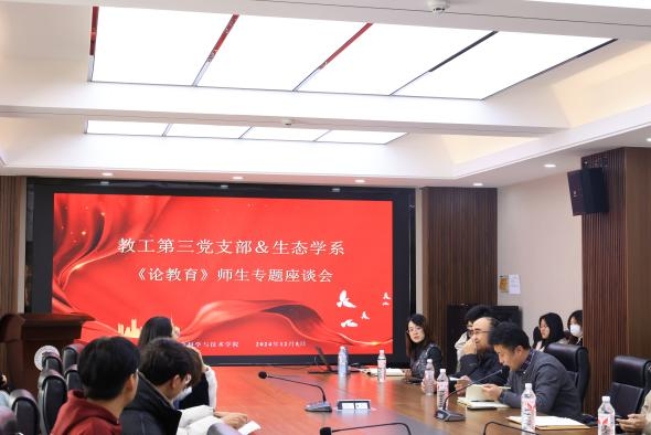 12月5日下午,必赢官网教工第三党支部联合生态学系在生物楼三楼会议室组织召开了《论教育》师生专题座谈会。教工第三党支部成员、学院参与生态学专业教学及管理的部分教师、2024级生态班全体同学与2021级生态班的两名学生代表参与了本次座谈交流。会议由支部书记吴艳玲主持。