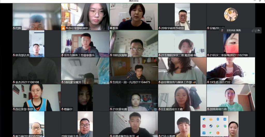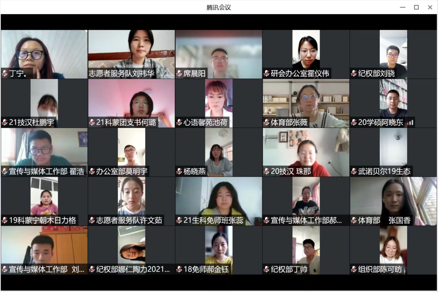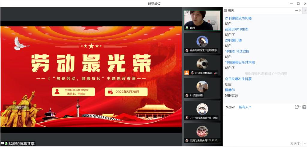 5月20日,必赢国际437官网召开了“劳动教育宣传月”活动交流推进会,分为研究生专场和本科生专场分别在线上召开,学就办主任默原老师、团总支副书记李自蹊老师、辅导员胡日查老师出席了会议。在两场会议上,学就办组织学生干部深入学习了习近平总书记在全国教育大会上的讲话精神和自治区相关文件,分别向研究生和本科生学生干部解读了必赢官网《“学生劳动教育宣传月”实施细则》,并就近期必赢官网所开展的“劳动教育宣传月”的活动进展进行了阶段性汇报,并听取了学生会各部门在实施劳动教育宣传活动的工作进展和各班实施劳动教育的典型做法。