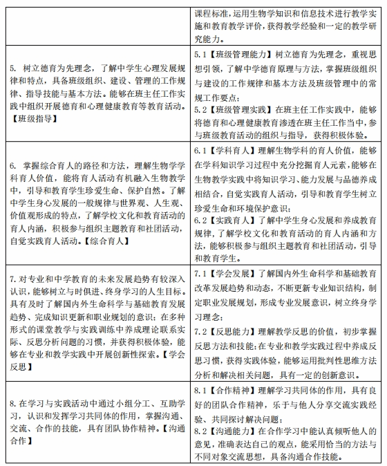 目标4:熟悉生物学学科发展趋势,形成专业发展意识,树立终身学习理念,进行学习和专业发展规划;了解国外生物学教育改革发展的趋势和动态,能够借鉴国际先进教育理念进行教育教学;具有一定的创新意识,能够运用批判性思维方法分析和解决教育教学问题;能够开展合作教研,持续提升教学能力和水平。