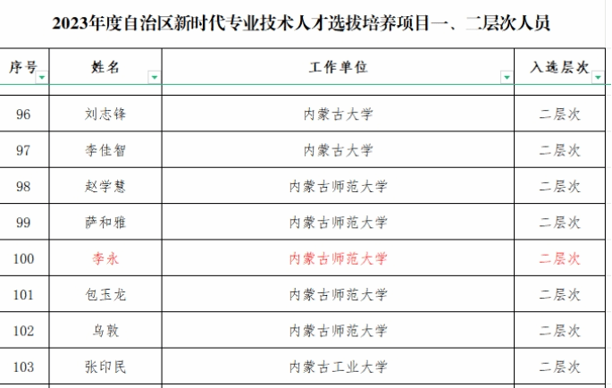 12月28日,自治区人力资源和社会保障厅公布了2023年度自治区新时代专业技术人才选拔培养项目一、二层次人员名单。按照《关于开展2023年全区“新时代专业技术人才选拔培养项目”人选选拔培养工作的通知》(内人社办发〔2023〕147号)安排部署,经个人申报及单位推荐,必赢官网李永教授入选自治区新时代专业技术人才“二层次”人才。