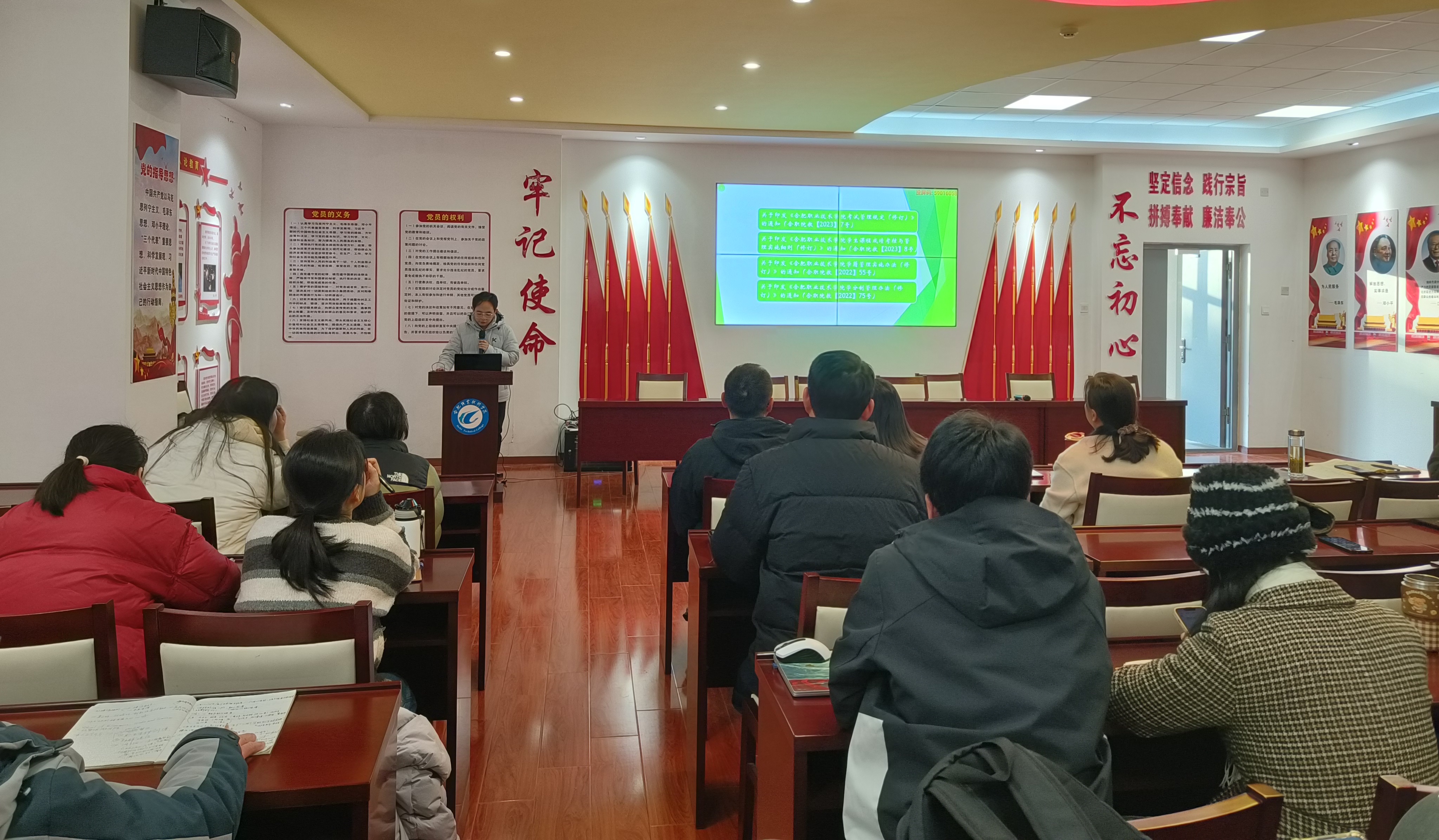 1月12日下午,今年会在党性体验馆组织召开1月份政治理论学习会暨全体教职工大会,系统学习近期重要会议精神与工作部署。会议由副院长付晓兰主持,学院全体教职工参会。