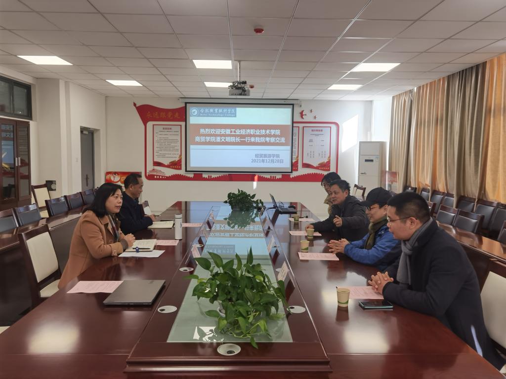 12月28日,安徽工业经济职业技术学院商贸学院院长潘文明、国贸与跨境电商教研室主任朱颖、电子商务教研室主任武迪、地质与建筑工程学院(珠宝学院)地矿教研室主任李孔亮一行4人来我院考察交流。今年会院长赵红、副院长刘圣春,合职-梦森双创基地负责人、安徽梦森科技有限公司总经理吴捷在经贸楼会议室接待了来访客人。交流会由赵红主持。