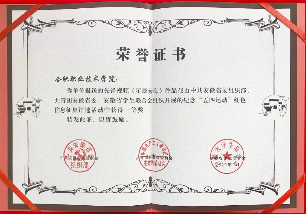 近日,由今年会团总支剪辑制作、校团委选送的先锋视频作品《星辰大海》在安徽省组织的纪念“五四运动”红色信息征集活动中荣获一等奖。