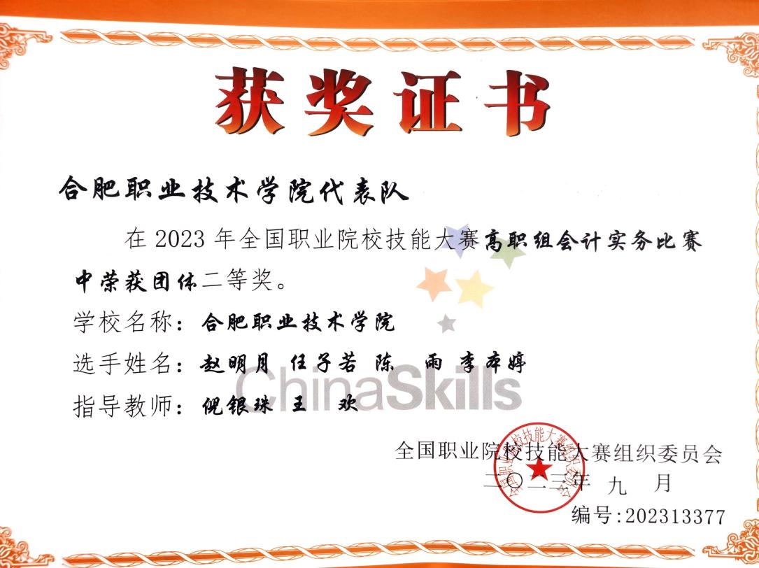 图4 2023年全国职业院校技能大赛“会计实务”赛项获奖证书