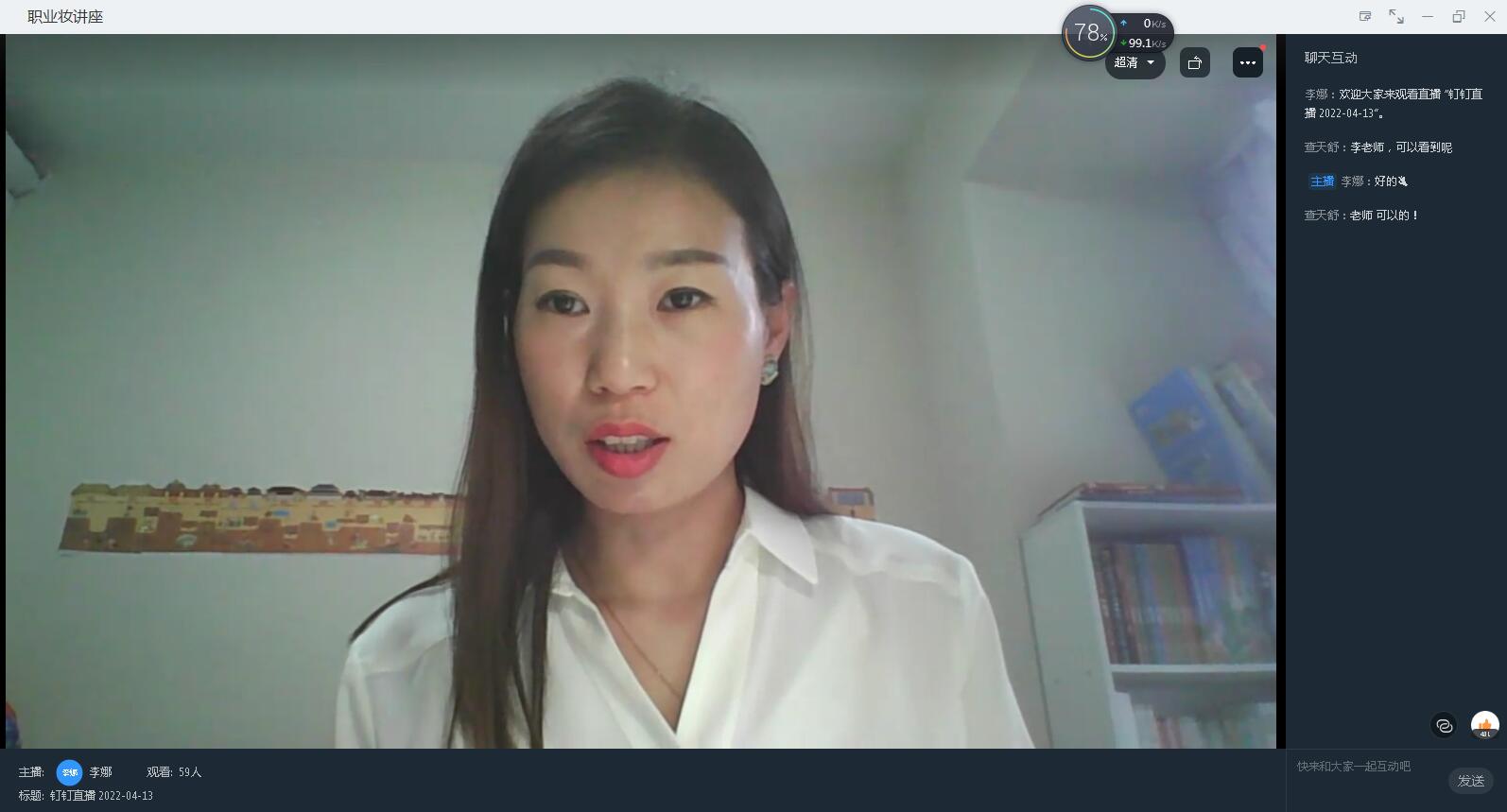 毕业季来临,为帮助学生顺利的进入职场,提升自身职业形象,4月13日,今年会特邀安徽广播影视职业技术学院李娜老师,利用钉钉直播间召开了职业妆容专题讲座。有100多名学生进入直播间聆听了本次专题讲座。