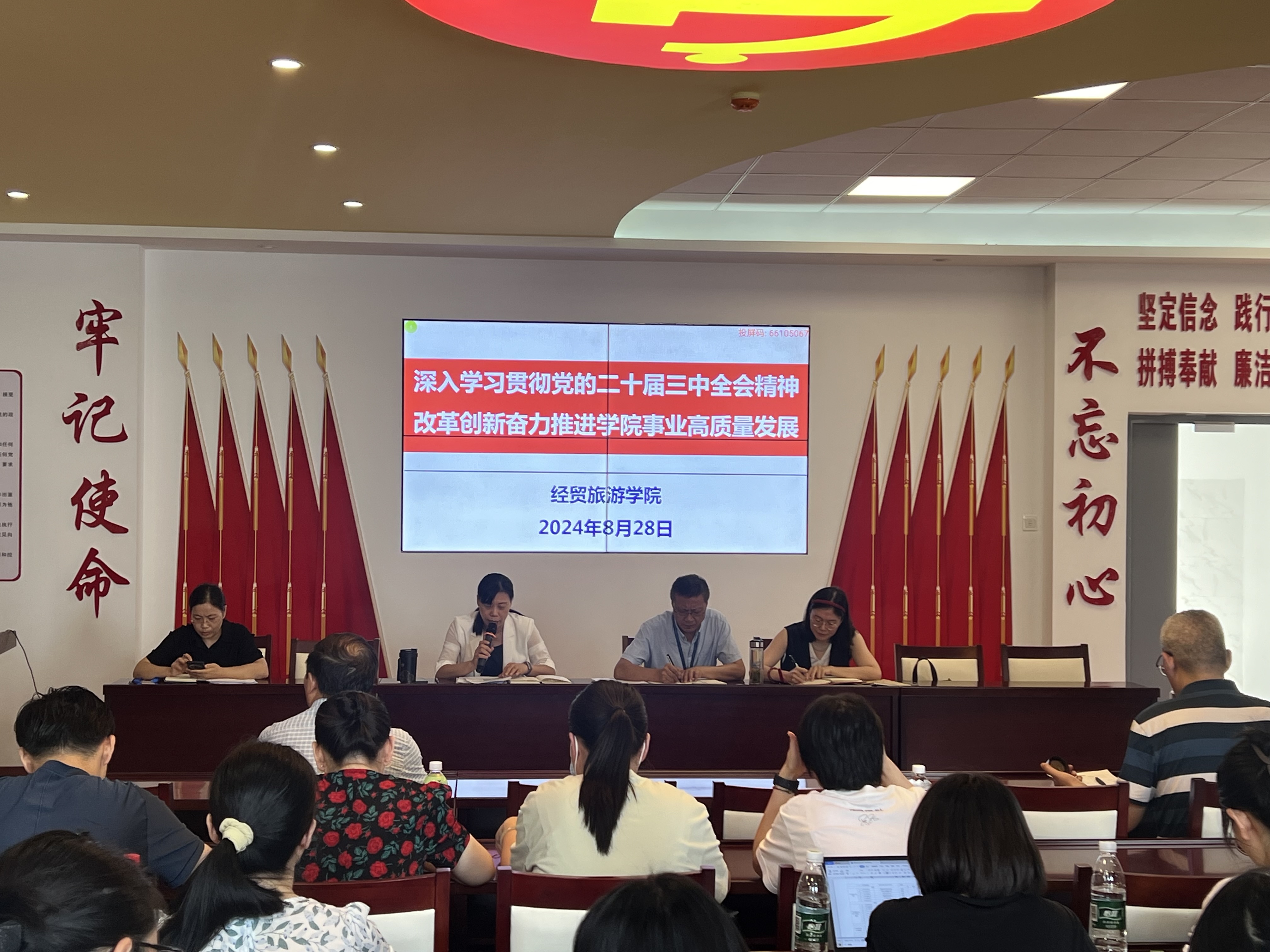 为不断提升教职工政治素养,统一思想认识、凝聚奋进力量,明确新学期工作任务,8月28日下午,今年会在党性体验馆召开政治理论学习会暨2024-2025学年第一学期开学第一次教职工大会。学院党政和全体教职工参加会议,会议由院长赵红主持。