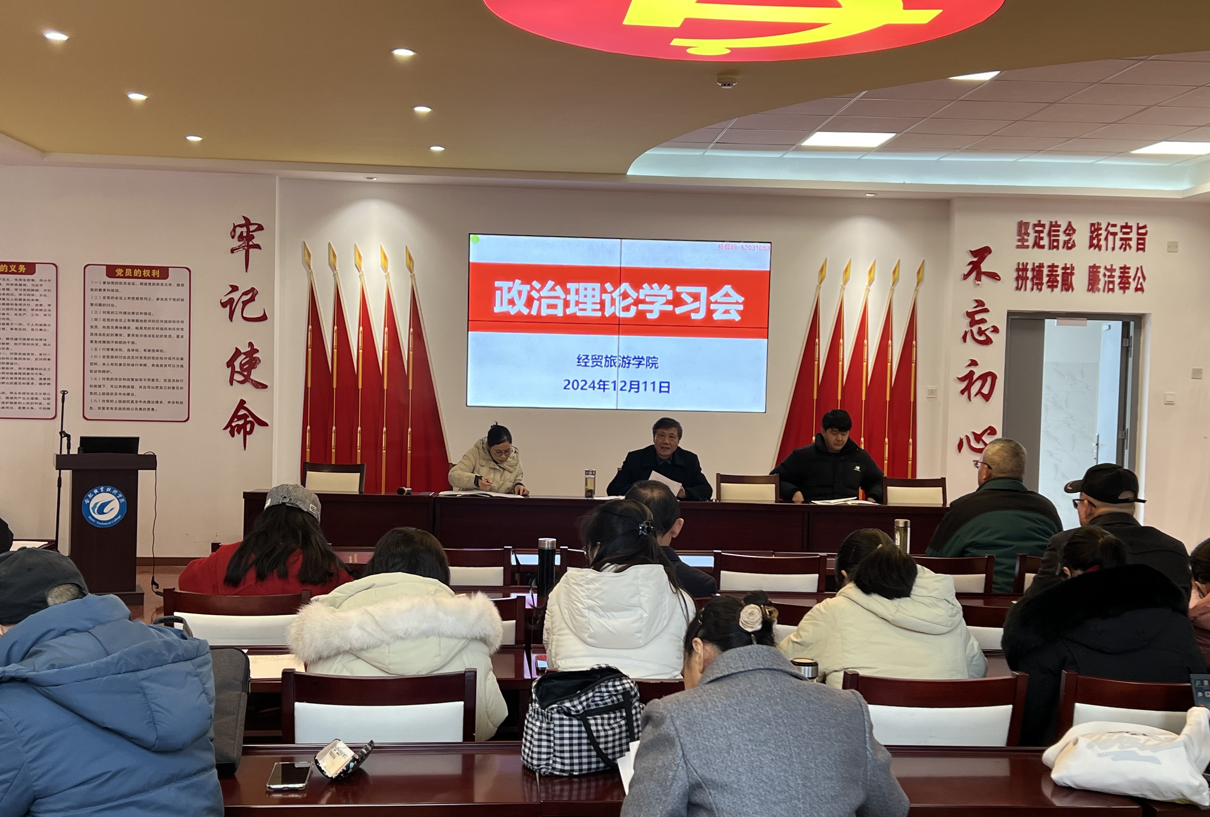 12月11日下午,今年会在党性体验馆召开了政治理论学习会暨全体教职工大会。学院党政、全体教职工参加会议,会议由副院长付晓兰主持。