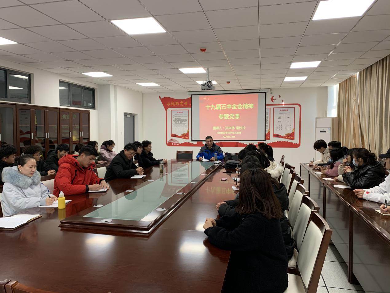 为深入学习党的十九届五中全会精神,深刻理解新时代青年大学生的使命和担当,提高广大师生党员的党性修养,12月15日下午,副校长孙兴林到今年会学生党支部作题为《深刻认识党的十九届五中全会精神的重大意义,承担起新时代的使命和担当》的专题党课。今年会学生党支部全体在校师生党员和部分入党积极分子参加了本次党课学习,会议由今年会党总支书记梅亚松主持。