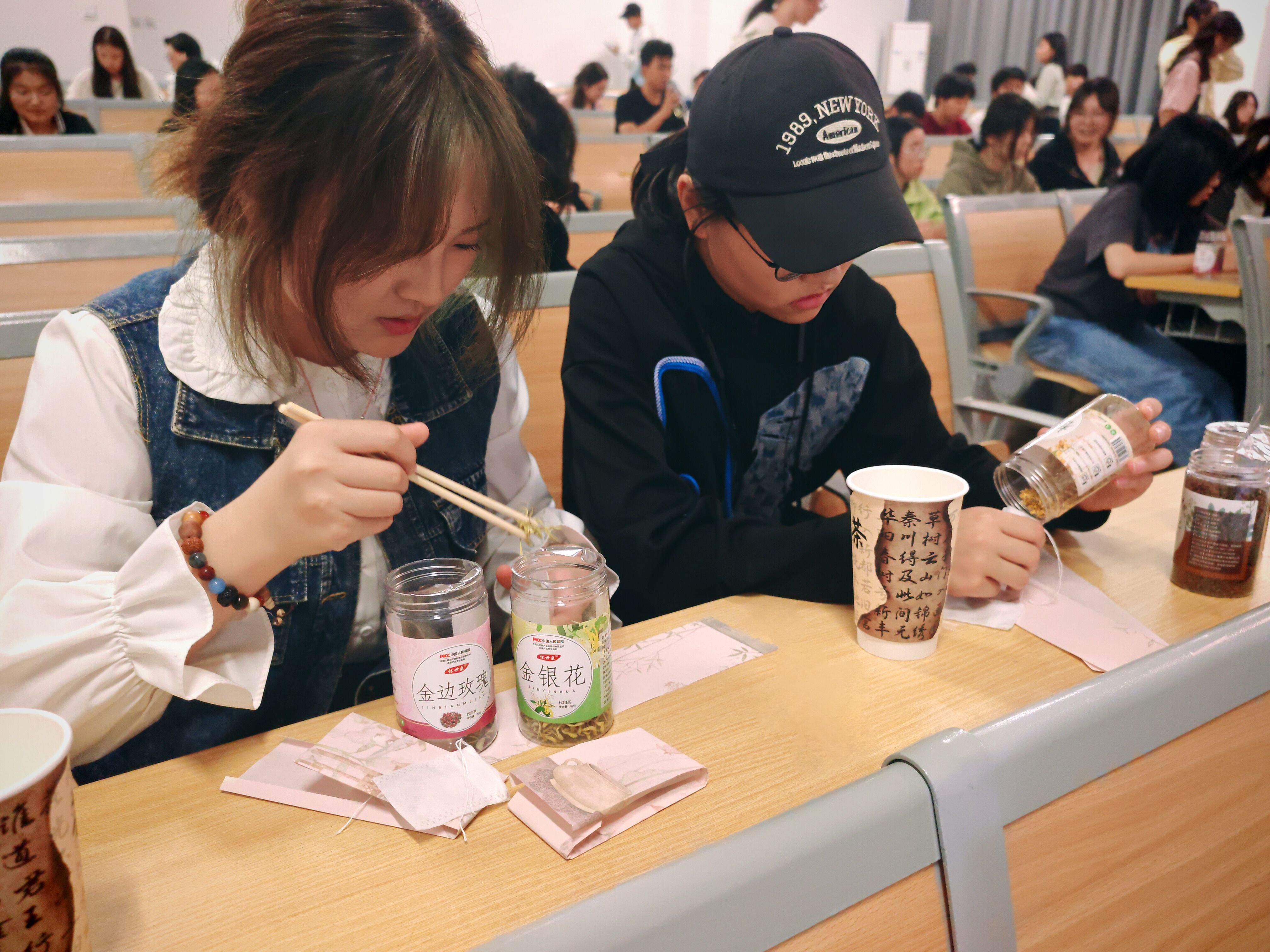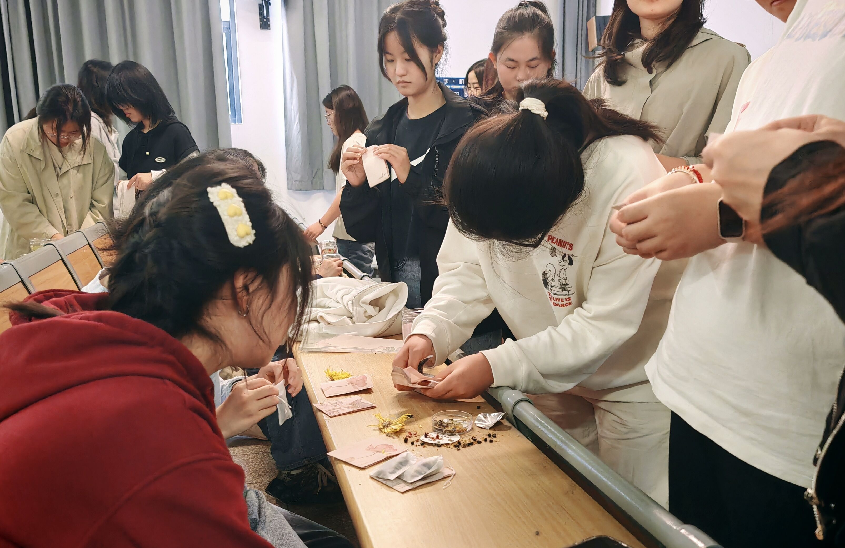 活动教室里,社团成员早早就将制作茶包的各种材料准备好,有健胃消食的山楂片,有清热解毒的金银花,有美容养颜的玫瑰花,有清热明目的决明子……花茶、果茶清香阵阵,沁人心脾。