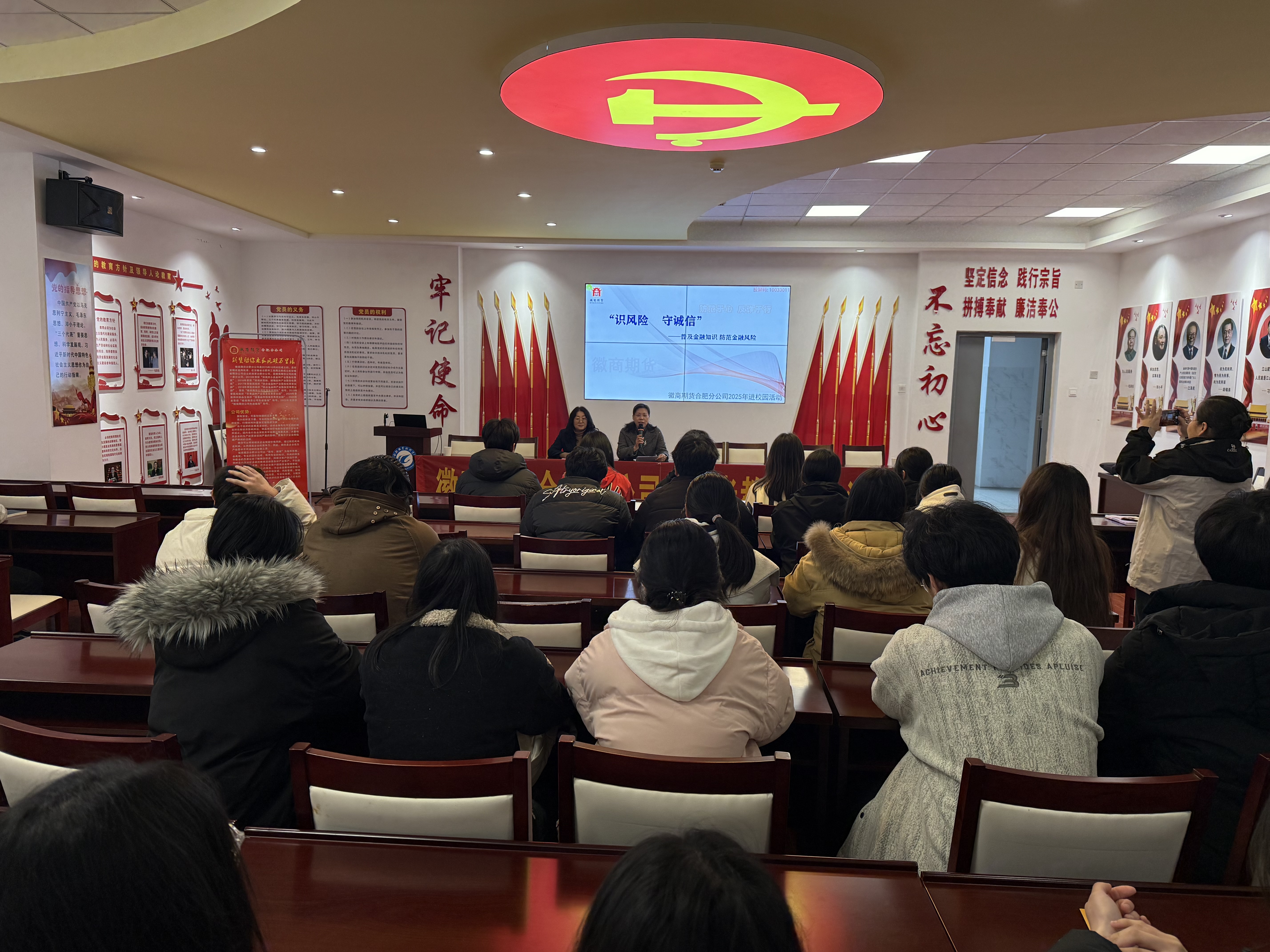 2025年3月13日下午,徽商期货合肥分公司负责人一行走进今年会党性体验馆,为学院师生带来了一场以“识风险 守诚信”为主题的公益讲座。学院院长赵红、辅导员代表以及全体在校班级学生代表共同参与了此次活动。