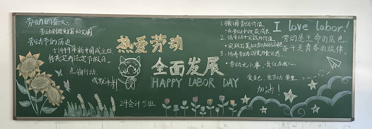 活动期间,学院组织开展了“劳模精神进校园”主题班会、劳动教育专题黑板报评比等活动。通过邀请劳模代表分享奋斗故事、学生自主研讨劳动意义等形式,生动诠释了“爱岗敬业、争创一流”的劳模精神与“执着专注、精益求精”的工匠精神。各班级黑板报设计创意纷呈,以图文并茂的形式传递劳动之美,成为校园内一道亮丽的文化风景线。