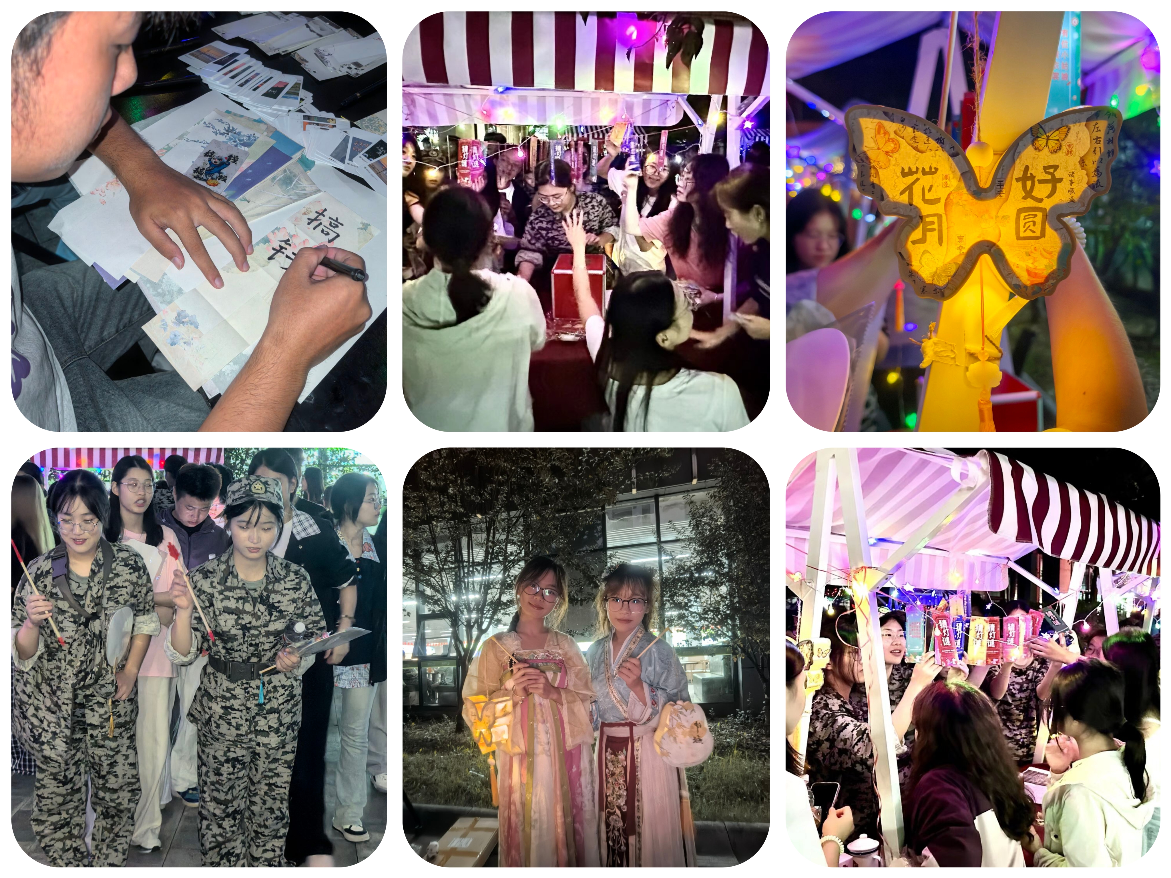 猜灯谜环节注重文化性与专业性结合,工作人员精心筛选 200 余条灯谜,内容涵盖中华诗词、历史典故及国际贸易、旅游管理等专业知识,既考验同学文化积累,又强化专业认知;汉服展示环节以 “弘扬传统服饰文化” 为主题,精选襦裙、曲裾、明制汉服等代表性服饰,由学院礼仪队志愿者进行展示;DIY 绘画团扇、后羿射日投壶、飞花令等环节同样亮点突出,DIY 绘画团扇环节提供空白团扇、环保颜料等材料,鼓励同学发挥创意,创作中秋主题作品;后羿射日投壶环节还原传统娱乐形式,引导同学体验古人节日乐趣;飞花令环节以 “月”“秋” 为核心关键词,组织同学开展诗词接龙,展现深厚文化底蕴;随舞挑战环节则将传统节日氛围与青春活力相结合,同学自发参与舞蹈表演,展现积极向上的精神风貌,进一步增强活动互动性与感染力。