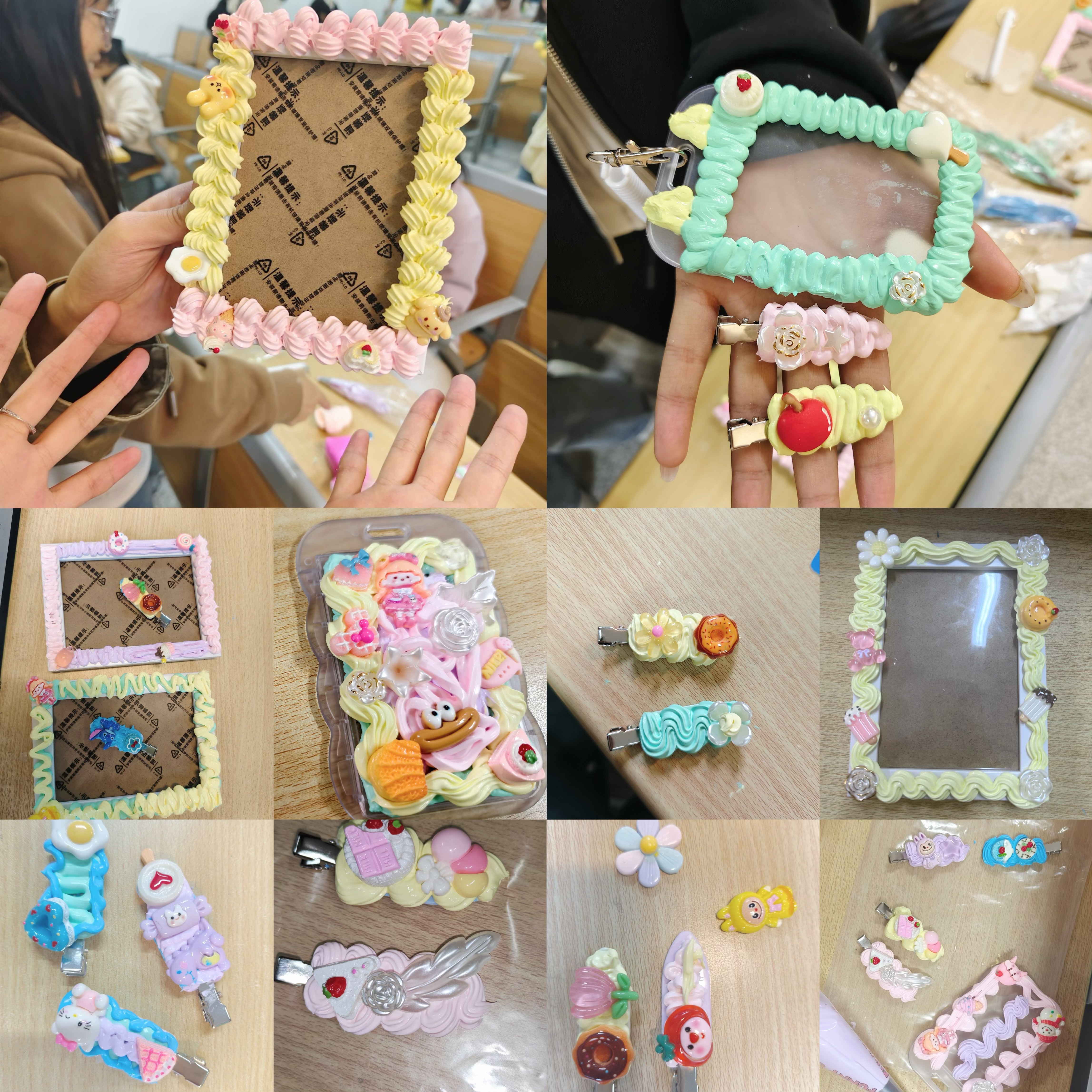 活动伊始,同学们有序签到并领取了丰富多彩的奶油胶、超轻粘土及各色装饰配件。在认真聆听完现场志愿者关于基础制作技巧的讲解后,大家便兴致勃勃地投入创作。同学们充分发挥想象力,将柔软的奶油胶挤出缤纷的立体图案,巧妙地装饰在卡套和发卡等物件上,或用超轻粘土捏制出可爱灵动的造型。活动现场气氛热烈而温馨,每一个独一无二的作品,不仅是艺术表达的成果,更是同学们内心情绪的真实流淌与压力释放的见证。在轻松愉快的创作过程中,同学们彼此交流灵感、互相帮助,不仅在实践中“胶”到了朋友,更用双手“粘”住了当下的快乐与专注,增强了集体归属感。