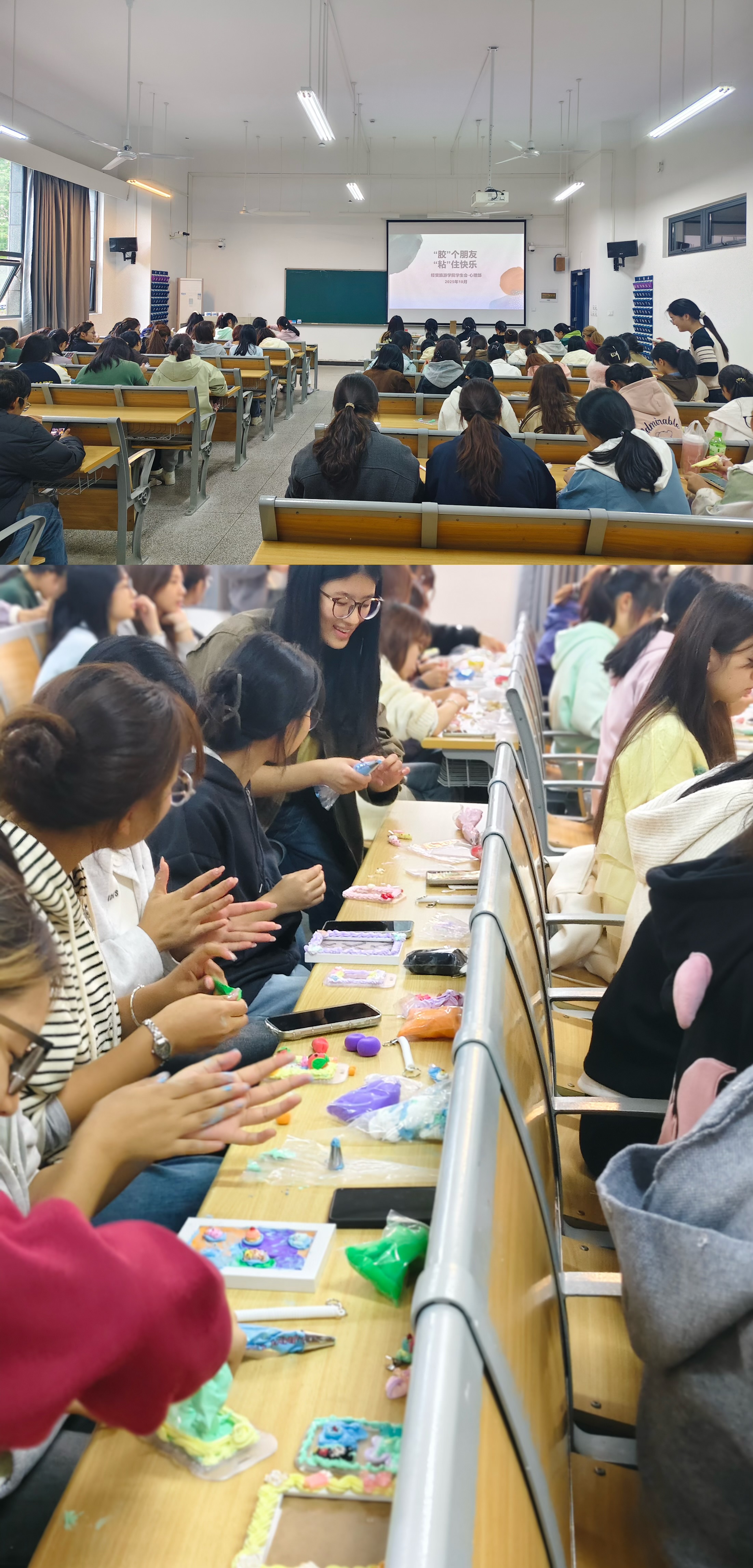 继观影活动后,10月29日下午,学院在南教111教室举办了别开生面的“‘胶’个朋友,‘粘’住快乐”奶油胶和超轻粘土DIY活动。活动由学院学生会·心理部周密策划与筹备,吸引了众多同学踊跃报名。