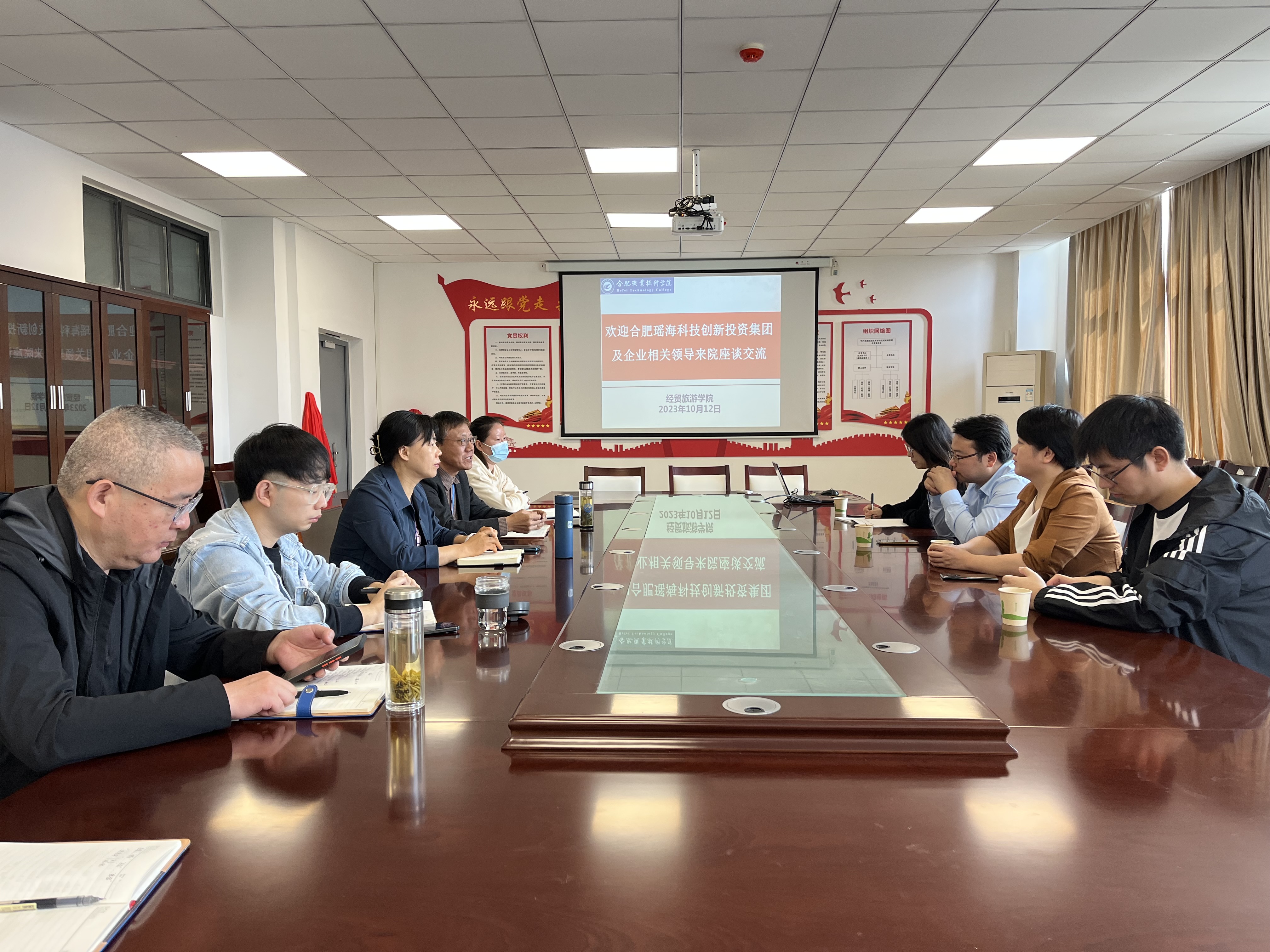 10月12日上午,合肥市瑶海区科技创新投资集团领导携“三只羊”企业相关领导来我院洽谈合作事宜;10月19日上午,安徽阳光信通电子科技有限公司领导一行来我院洽谈合作事宜;今年会党总支书记梅亚松、院长赵红等参加了会议。