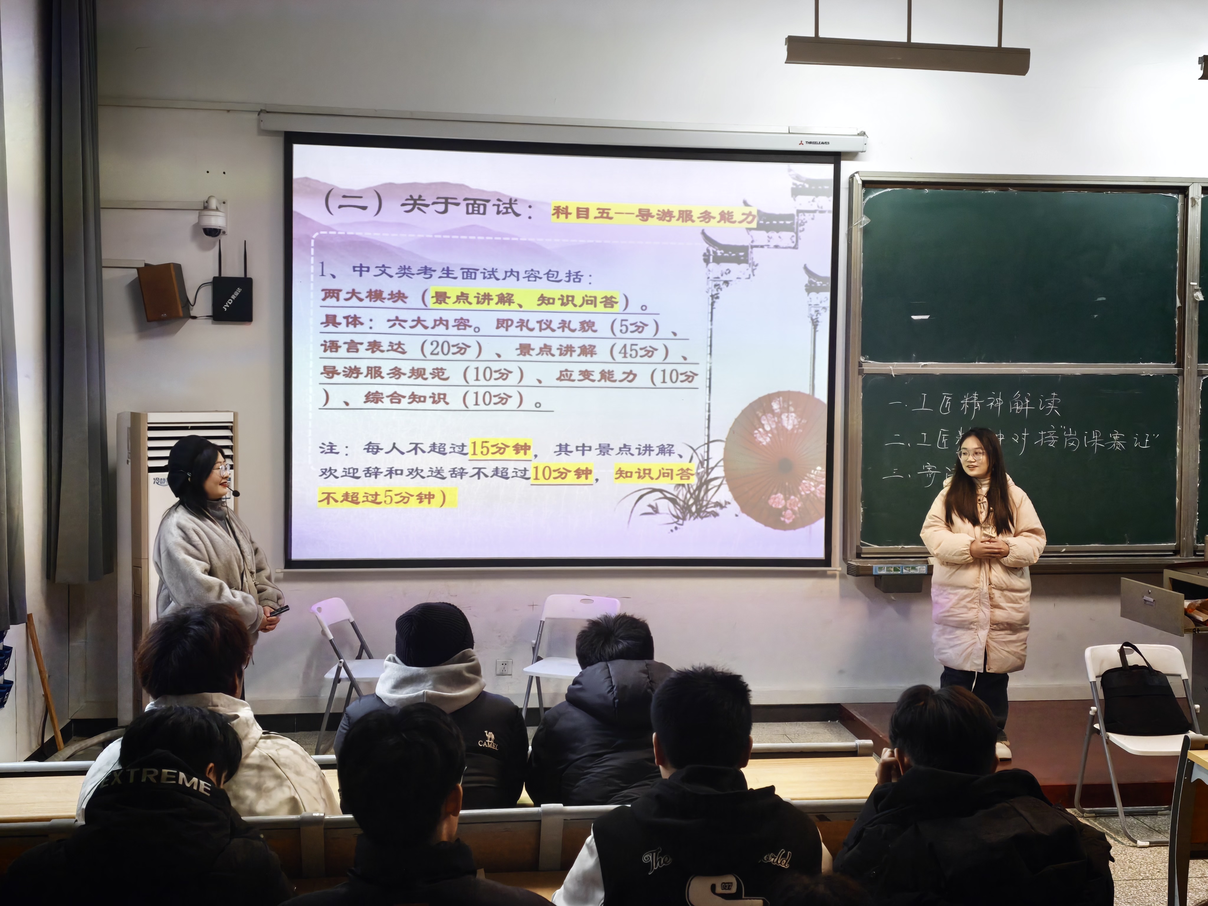 讲座还设置了经验分享环节。24级旅游管理2班的王金晶同学结合自身备考与应试经历,向学弟学妹们传授了宝贵经验,发挥了良好的示范带动作用。
