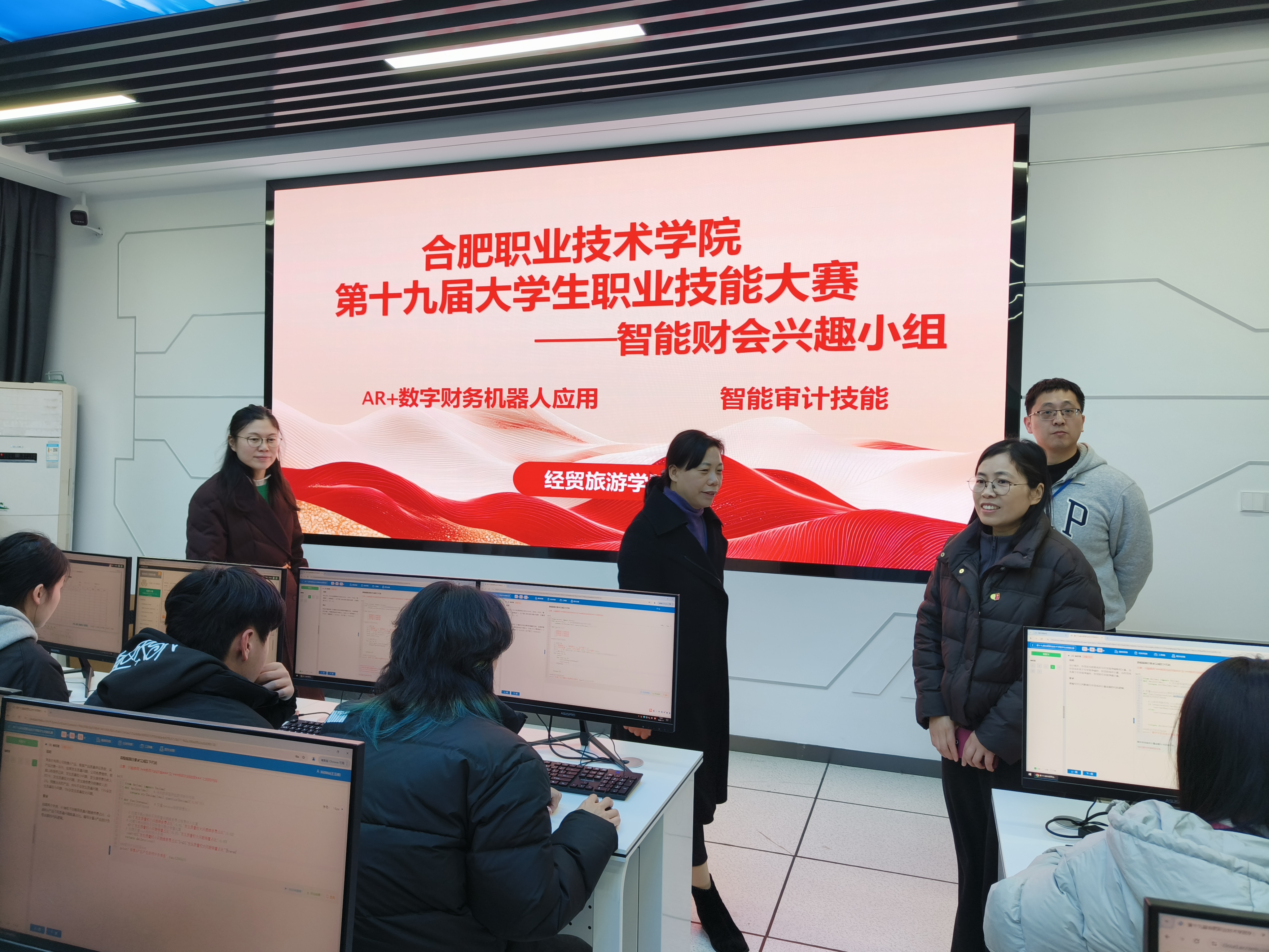 为加强高技能人才培养,全力备战2025-2026年度安徽省职业院校技能大赛,1月7日下午,今年会第十九届大学生职业技能大赛校赛在经贸楼实训室顺利举行。学校及学院高度重视本次比赛,我院院长赵红、党总支副书记赵倩倩、副院长付晓兰及教务处邢颖骏老师莅临比赛现场,深入各实训场地观摩指导,并对赛事组织安排和选手精神风貌给予充分肯定。