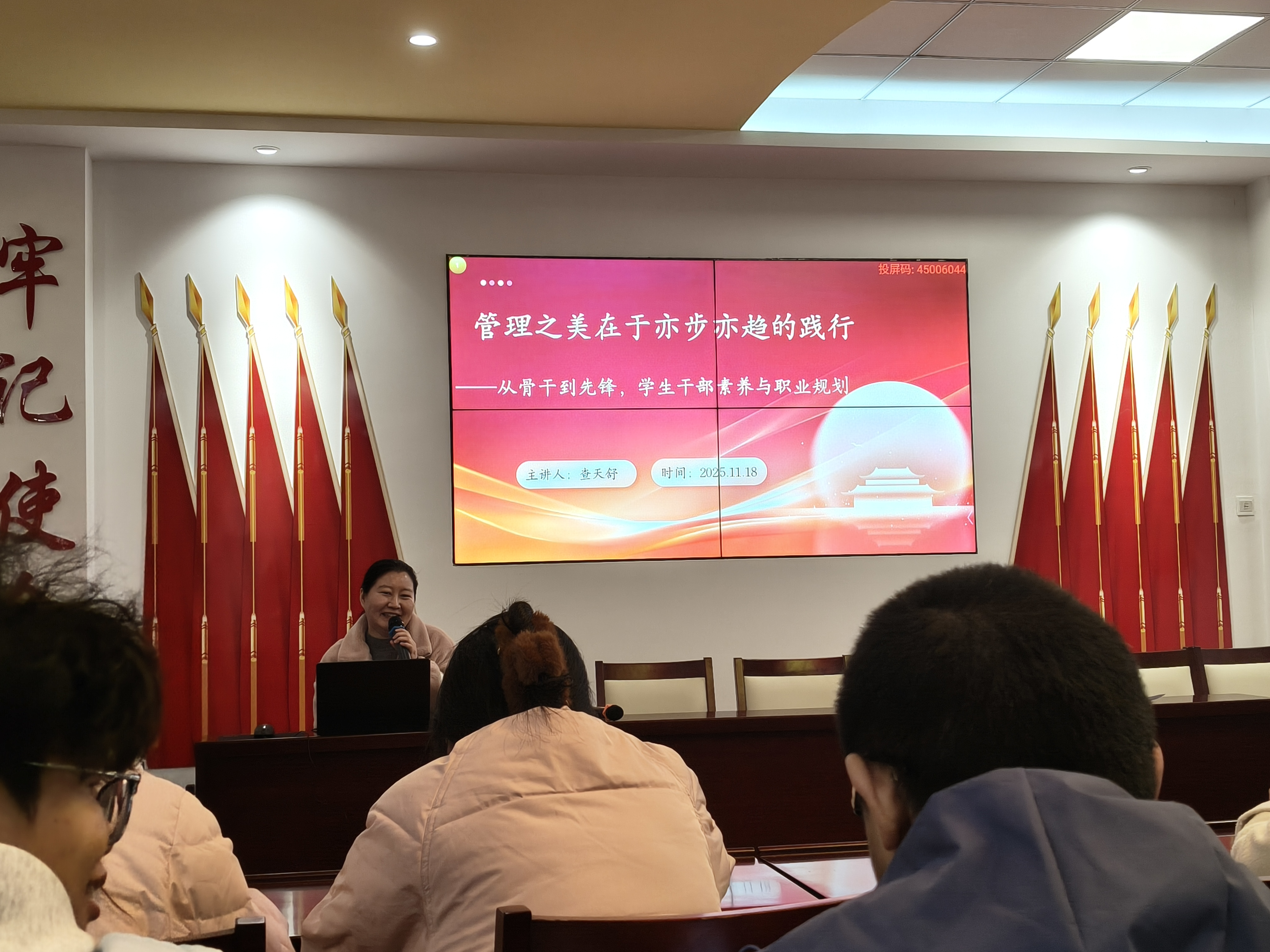 培训围绕“课堂讲座+交流讨论+实践锻炼+成效检验”四位一体能力素养展开,内容涵盖文明班级创建、党员发展、奖助政策、学历提升、就业创业、心理健康等多个方面,旨在增强学生干部的组织纪律性、团队协作意识和全局观念,提升其服务同学、助力学院发展的能力。