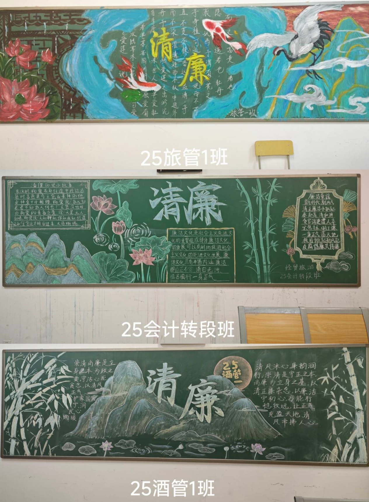 廉洁主题黑板报 同学们将廉洁精神与经贸旅游专业特色深度融合,以粉笔触勾勒廉洁典故,用图案解读清风内涵,一幅幅主题鲜明、版式新颖的黑板报,不仅成为班级文化的“风景线”,更让大家在构思创作中深化了廉洁认知,厚植了自律自觉。