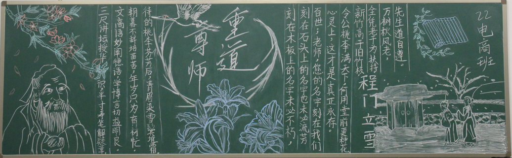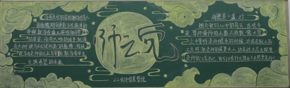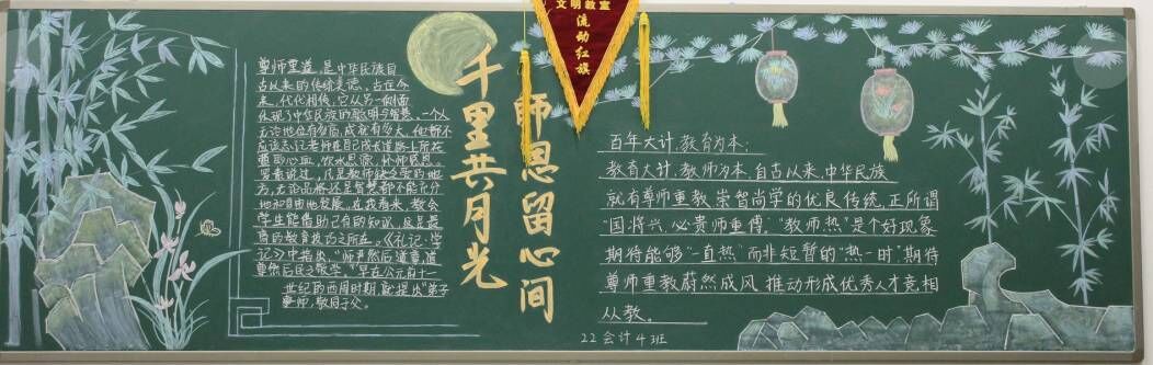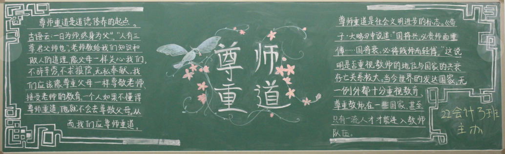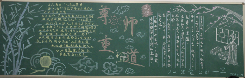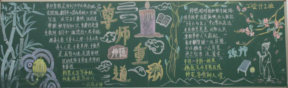 为了加强师德师风建设,增强全体教师教书育人、为人师表的责任感和使命感,积极开展师德师风宣传教育活动,努力营造良好的师德师风舆论环境和氛围。今年会团总支根据学校师德师风建设工作安排,于10月中旬在22级团支部中组织开展“尊师重道”宣传教育板报评比活动。