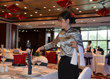 实习企业对我校实习生的综合表现十分满意,实习生的综合素质亦得到全面提升。学生们已然形成了在做中学、学中思、思中进的良好工作态势,能够将在校期间学习的理论知识熟练运用到实际工作中,积极克服困难,较好地完成企业方交付的工作任务,让顶岗实习的学校与社会衔接作用得到了很好的发挥。在安徽饭店2020年度岗位技能大赛中,“冠名班”7名同学分别获得了中、西餐摆台和中、西餐主题设计四项比赛的前三名,其中张子平同学更获得了西餐主题设计比赛项目第一名的好成绩。