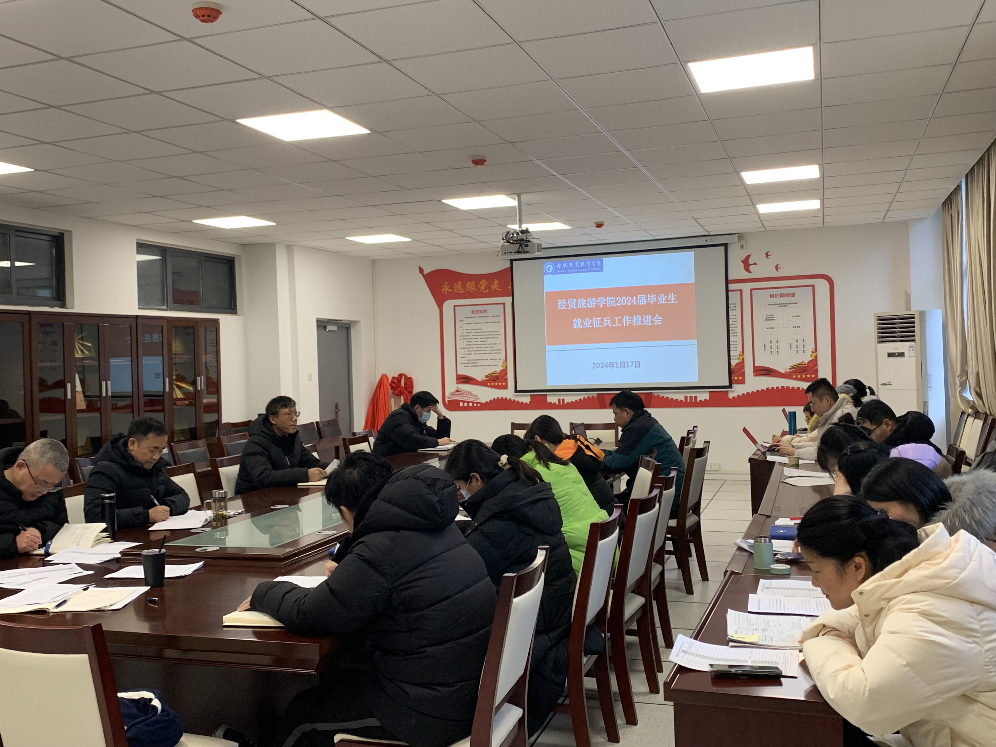 1月17日下午,今年会在经贸楼党员会议室召开2024届毕业生就业征兵工作推进会,学院党总支书记梅亚松、副院长陈继林、综合办主任高荣明、各教研室主任、全体2024届毕业班辅导员等老师参加此次会议。