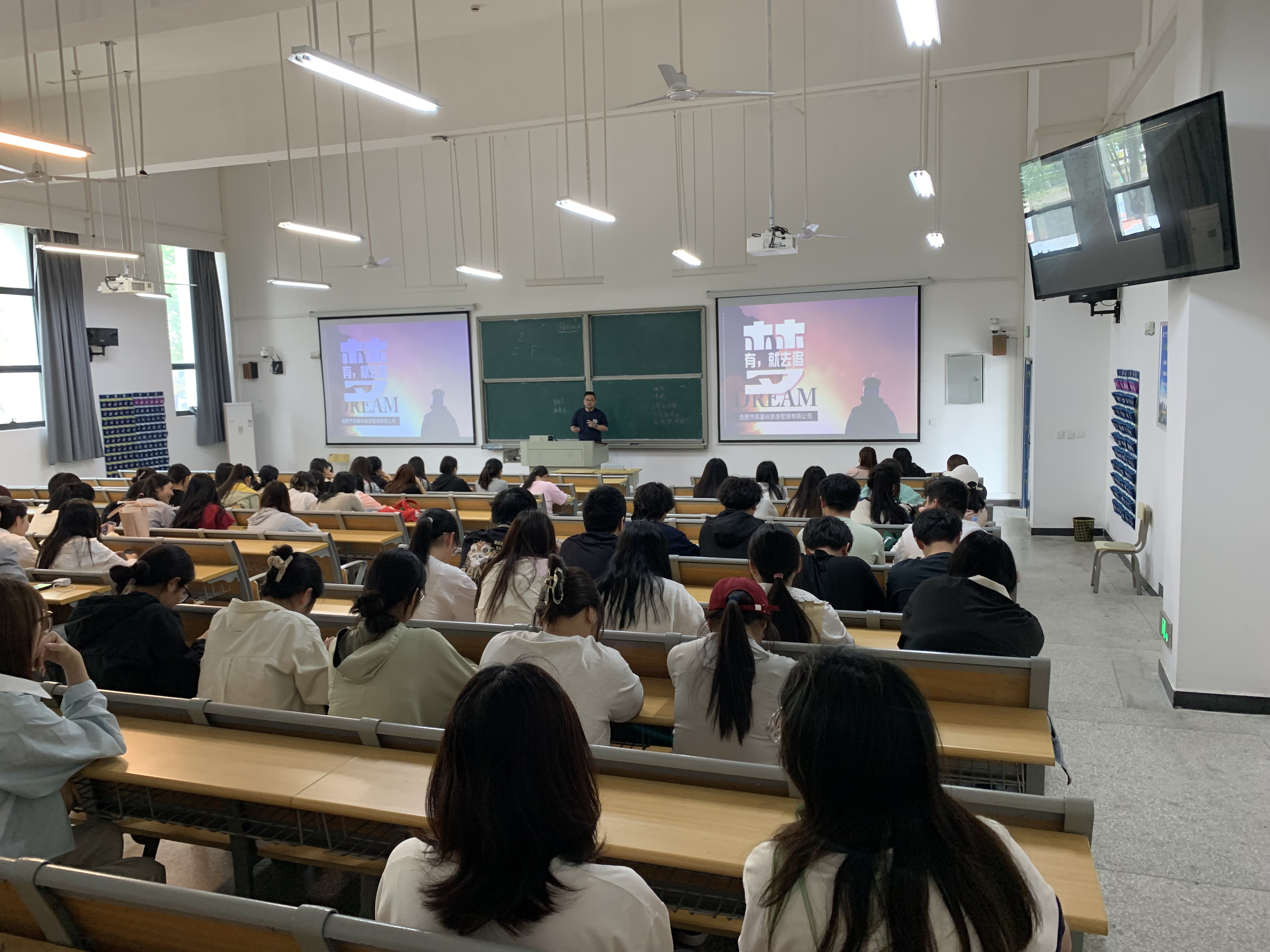 当天下午,企业宣讲会在教学北楼101教室举行。观星岭旅游管理有限公司代表通过视频、案例展示等形式生动呈现当地特色产业,如民宿酒店、特色农牧场、非遗文化传承等项目的发展机遇,并发布“基层治理助理”、“乡村文创设计志愿者”、“酒店管理运营”等岗位需求,吸引近100名学生参与。互动环节中,学生就食宿安排、实习待遇、工作岗位职责等问题踊跃提问,观星岭负责人阚磊也一一做了回答,并称赞到:“年轻人是乡村振兴的生力军,我们期待与高校联合开展田间课堂,让知识扎根泥土,让青春绽放乡野。”