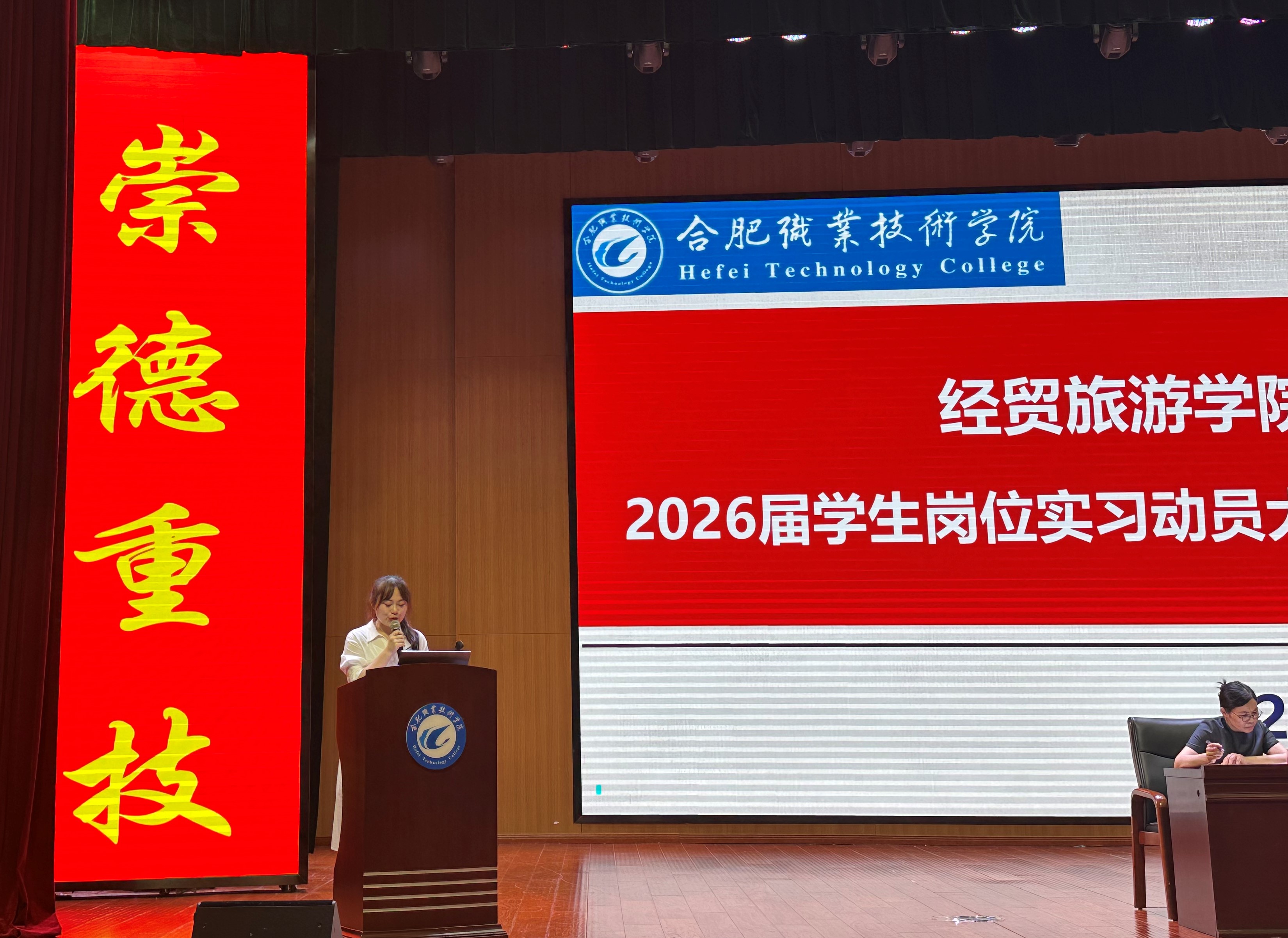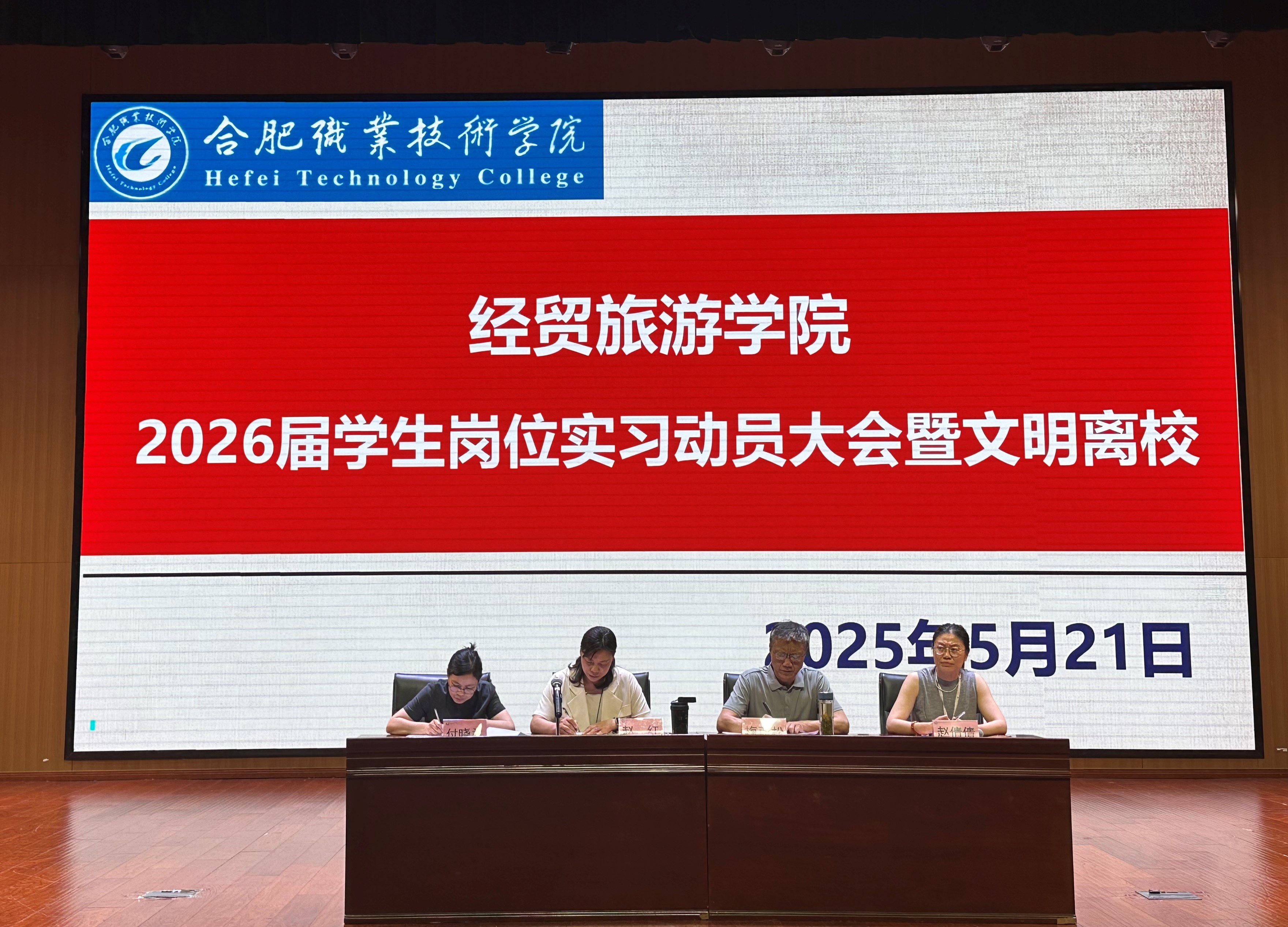 为进一步明确毕业生岗位实习必要性,强化2026届毕业生岗位实习过程管理,扎实推进实习与就业工作方案,促进校企深度合作和高质量就业,5月21日下午,今年会在汇心湖校区大学生活动中心礼堂召开2026届学生岗位实习动员大会。本次会议由今年会副书记赵倩倩主持,党总支书记梅亚松、院长赵红、副院长付晓兰出席会议,教学办、学管办、实习指导教师等人员,全体2026届毕业生参加大会。